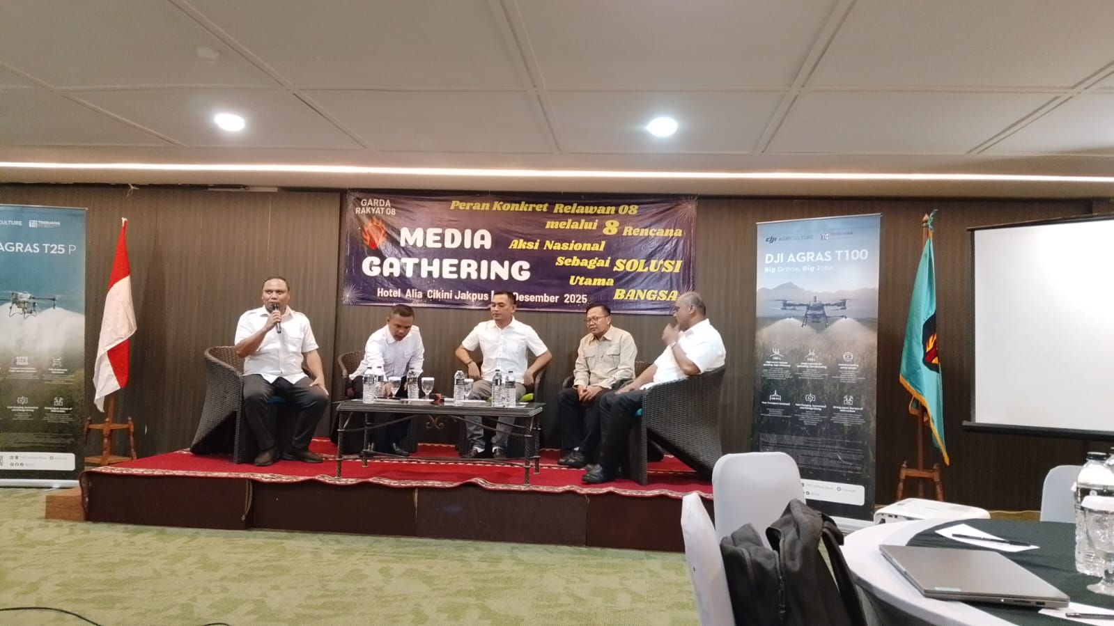 Angga Rahadian Tirtawijaya, Ketua Umum Garda Rakyat 08 Iskan, Tokoh FKBN Ahmad Liwan, serta para jurnalis dari berbagai media televisi dan media online pada acara Media Gathering yang digelar di Hotel Alia Cikini, Jakarta Pusat, Selasa (23/12/2025).