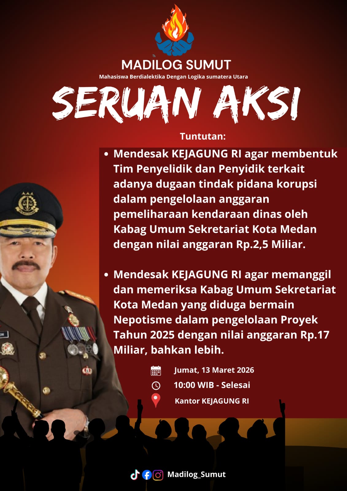 Jakarta – Lembaga Mahasiswa Berdialektika dengan Logika Sumatera Utara (MADILOG SUMUT) berencana menggelar aksi unjuk rasa di Kejaksaan Agung Republik Indonesia (Kejagung RI) pada hari Jumat, 13 Maret 2026. Aksi tersebut merupakan bentuk kontrol sosial terhadap dugaan kejanggalan pengelolaan anggaran di lingkungan Bagian Umum Sekretariat Kota Medan.