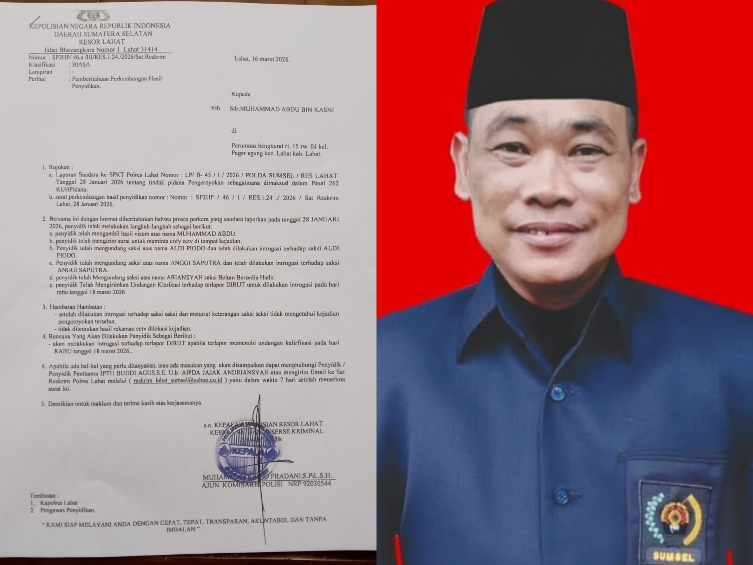 LAHAT I selatan.news – Hasil SP2IIP/46,u/III/RES.I.24./2026/sat Reskrim atas pengeroyokan seorang wartawan kabupaten lahat yang tergabung di Dewan Pers, Tersuktur di Organisasi PWI dan HMI memasuki babak baru. Rabu, (18/3/26)
