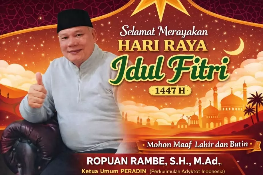 Jakarta – Ketua Umum PERADIN (Perkumpulan Advokat Indonesia), Ropuan Rambe, S.H., M.Ad., menyampaikan ucapan selamat Hari Raya Idul Fitri 1 Syawal 1447 Hijriah kepada seluruh umat Muslim di Indonesia.