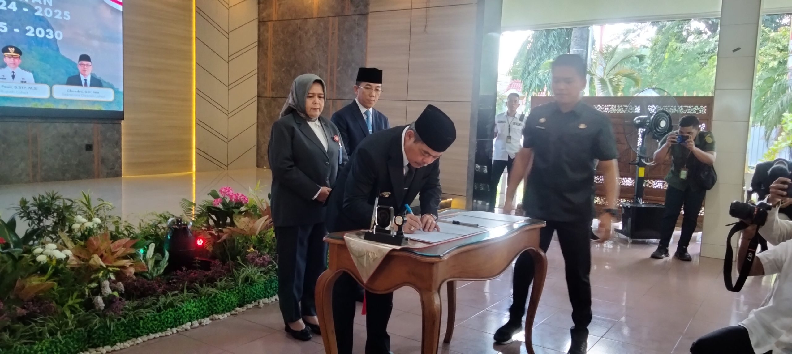 LAHAT I Selatan.News – Serah terima jabatan antara Penjabat (PJ) Bupati Lahat, Imam Pasli, dengan Bupati Lahat terpilih periode 2025-2030, Bursah Zarnubi, berlangsung di Pendopoan Rumah Dinas Bupati Lahat. Acara ini dihadiri oleh Wakil Bupati terpilih Widia Ningsih SH. MH, unsur Forum Koordinasi Pimpinan Daerah (Forkopimda), ketua DPRD Kabupaten Lahat beserta anggota DPRD Kabupaten Lahat, mantan Bupati Lahat periode 2008-2018 Saifudin Aswari SE, tokoh masyarakat, jajaran Organisasi Perangkat Daerah (OPD), camat se-Kabupaten Lahat, Ketua Forum Kepala Desa, serta tamu undangan lainnya. Rabu (5/3/2025)