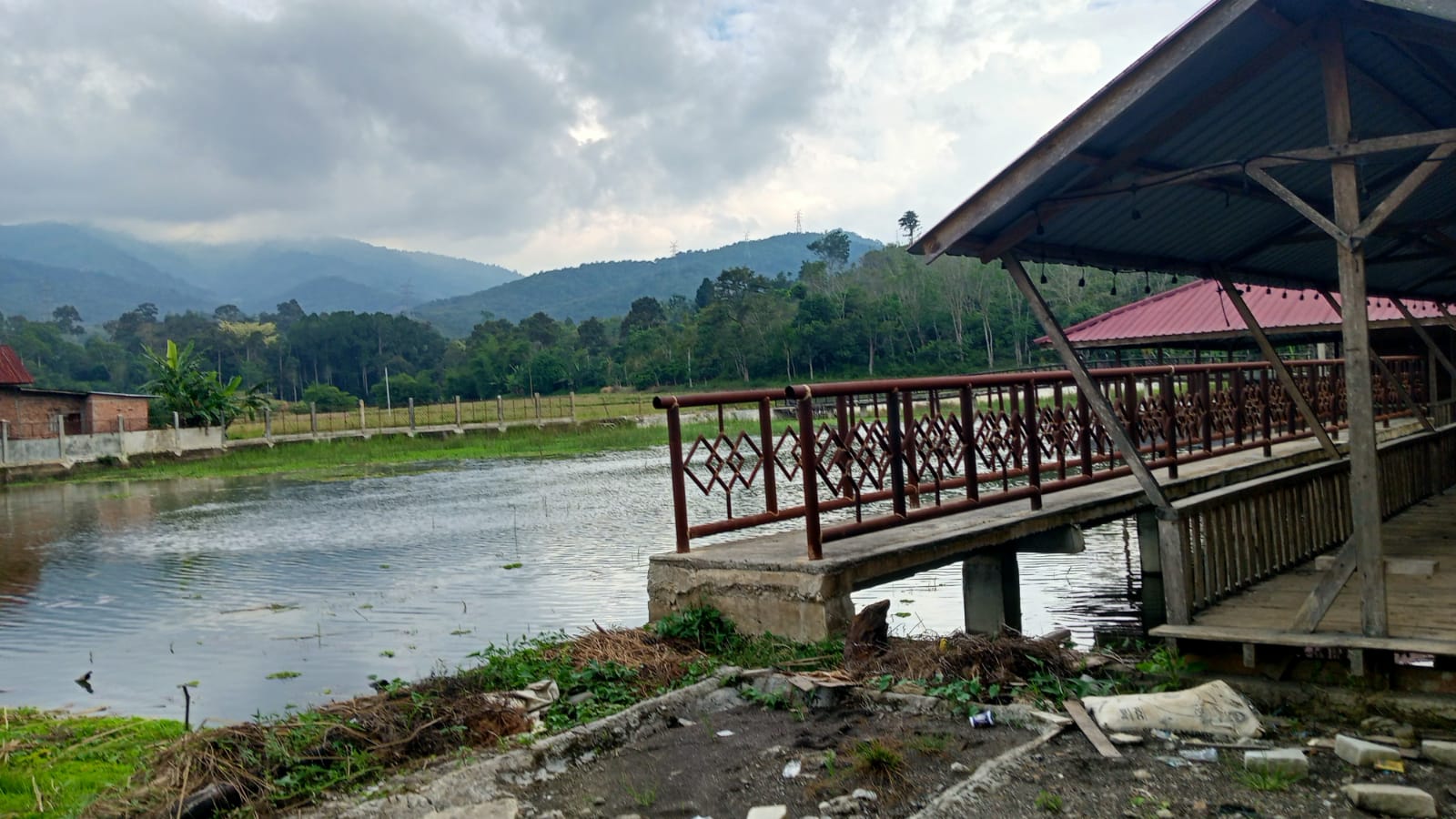 Berdasarkan pantauan di lapangan, kondisi lokasi tersebut kini terbengkalai. Sejumlah fasilitas tampak tidak terurus, seperti sepeda air berbentuk bebek yang dibiarkan di pinggir tebat, material bangunan berupa semen dan batu yang berserakan, serta pondok yang belum selesai dibangun.